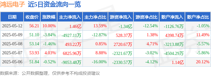 本站消息,鸿远电子5月12日涨停收盘,收盘价56.21元。该股于10点26分涨停,2次打开涨停,截止收盘封单资金为2309.67万元,占其流通市值0.18%。